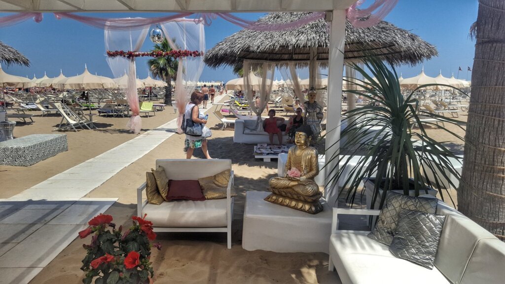 Rimini beach is long, wide, sandy and commercialized. It´s divided in to establishments called Lido. Each one is numbered and has a name, like #85 La Playa (special discount for the guests of our hotel). They have to maintain the area and they provide (for a fee) some kind of service and facilities (sun loungers, umbrellas, changing cabins…). Depending on how much you want to pay, you can get a simple lounge or you can have Jacuzzi facilities, gym equipment, a snack, un aperitivo… For the price of 18€ we got two loungers, an umbrella, a snack and a drink.